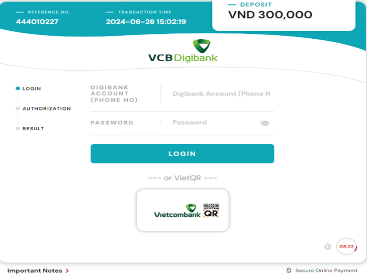 Bước tiếp theo vui lòng đăng nhập vào ngân hàng trực tuyến để thực hiện chuyển khoản. Lưu ý: Quý Khách cần nhập mã OTP do ngân hàng cung cấp qua tin nhắn để hoàn tất xác nhận giao dịch.