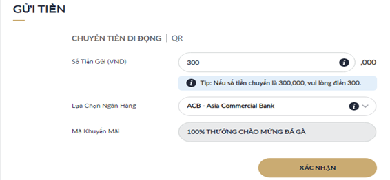 Nhập số tiền muốn gửi và Chọn ngân hàng để gửi tiền sau đó nhấp " Xác Nhận"