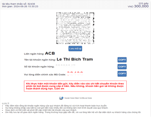 Đăng nhập vào Ứng Dụng Ngân Hàng Di Động và tiến hành quét mã QR. Lưu ý: vui lòng điền mã thấy tại mục "Nội dung điền:…" vào phần Nội Dung Chuyển Tiền trên phiếu gửi tiền của Quý Khách. Điền mã OTP để xác nhận giao dịch