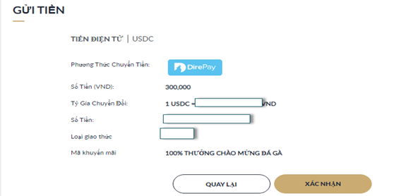 Nhấp vào "XÁC NHẬN" để được chuyển hướng đến trang giao dịch tiền điện tử hoặc nhấp vào "QUAY LẠI" để thay đổi số tiền gửi của bạn (Đảm bảo bật cửa sổ bật lên).