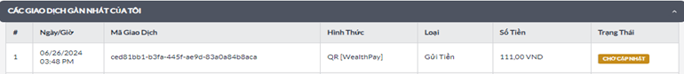 Số tiền sẽ được ghi có và hiển thị trên "CÁC GIAO DỊCH GẦN NHẤT CỦA TÔI".